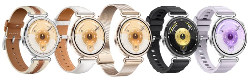 Le modèle Huawei GT 6 41 mm est disponible en 5 finitions de bracelet : 2 en cuir, 2 en fluoroélastomère et 1 en métal, façon milanaise. Ces modèles sont proposés entre 249,99 € et 299,99 €.