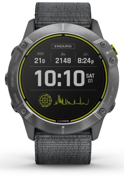 La Garmin Enduro, sortie en 2021, est une montre premium et chic offrant les mêmes fonctionnalités que la Fenix 6 standard (donc sans lecteur MP3 et sans cartographie) et un format identique à celui de la Fenix 6X Pro Solar, le plus gros modèle de la série.