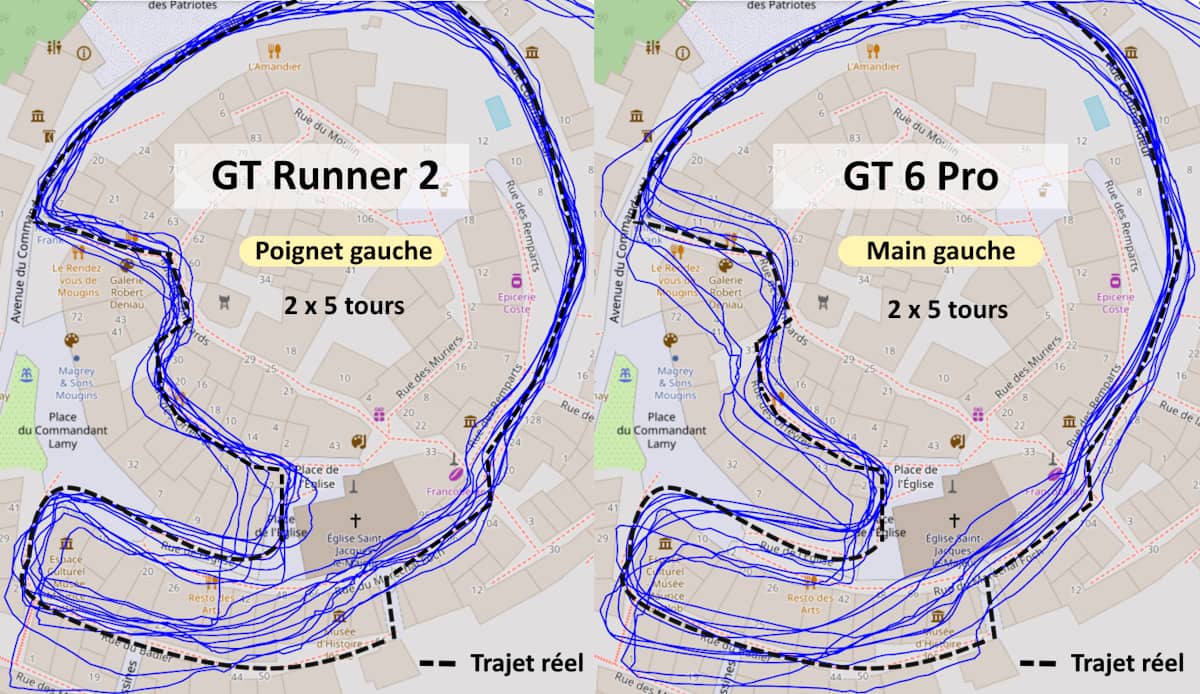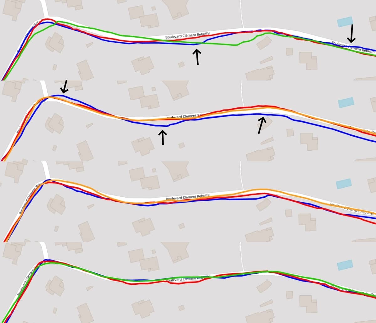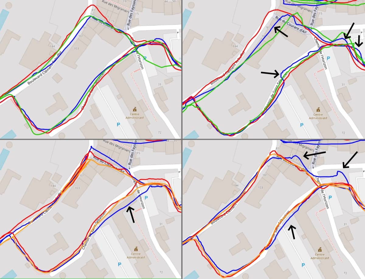 Cadre 1 : voici des exemples (2 traces du dessus, voir les flèches noires) de déviations ou d'éloignement de la trace de la GT Runner 2 (en bleu), bien visible aussi avec la GT 6 Pro (trace en vert).