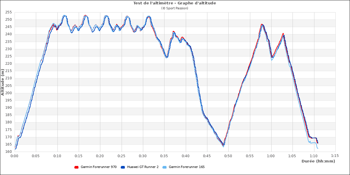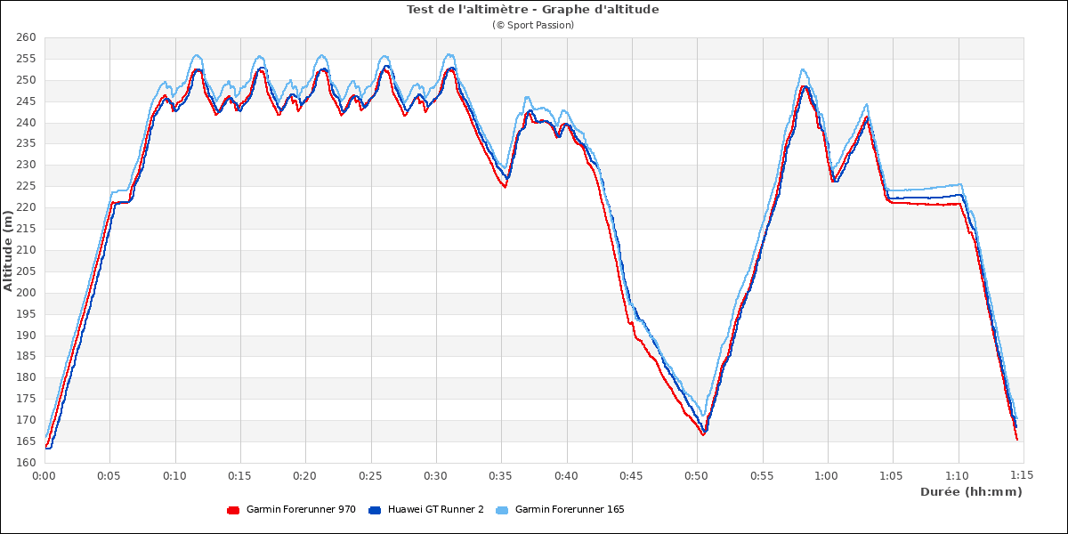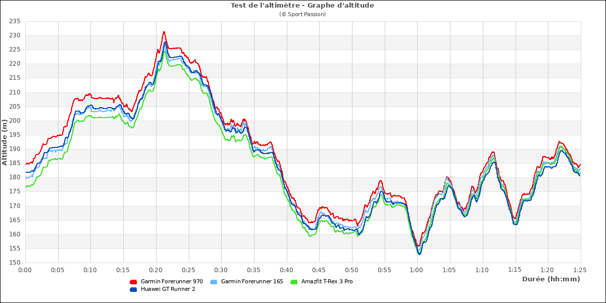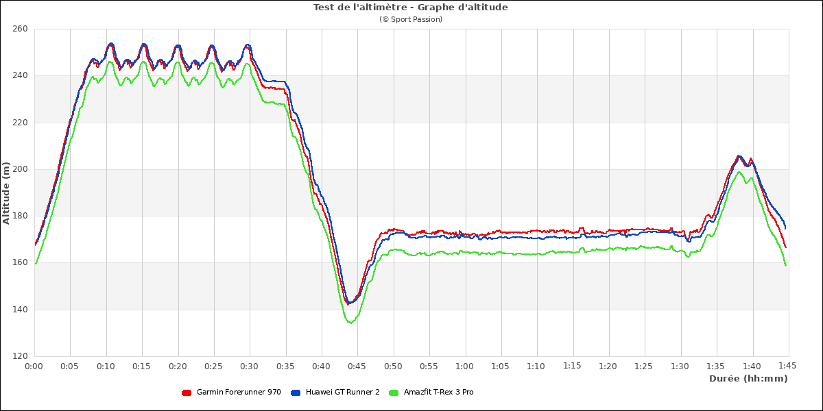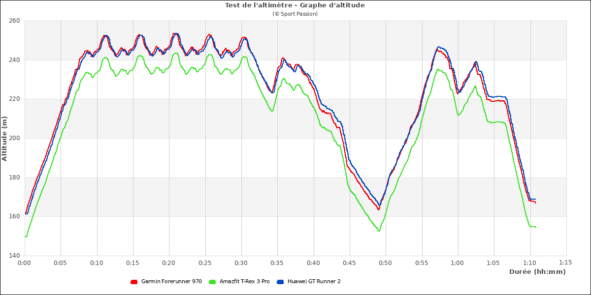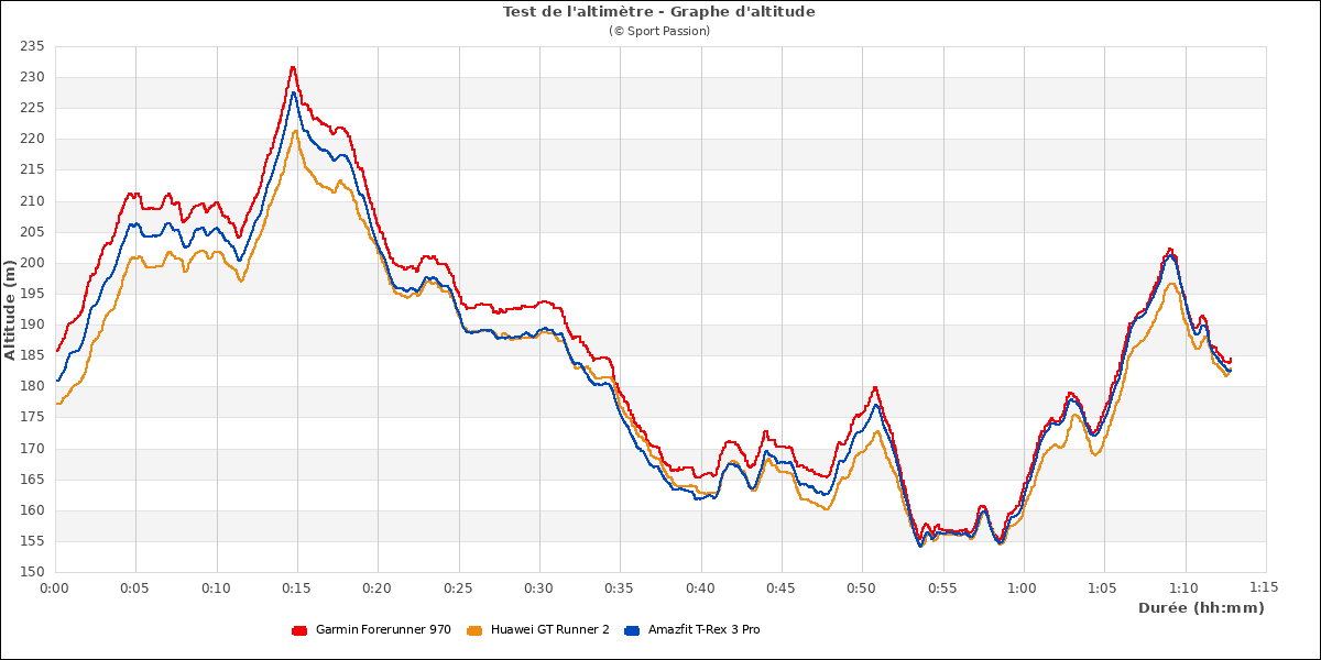 Sur celle-ci, la GT Runner 2 a tendance à afficher par endroits une altitude légèrement inférieure à celle enregistrée par les autres montres.