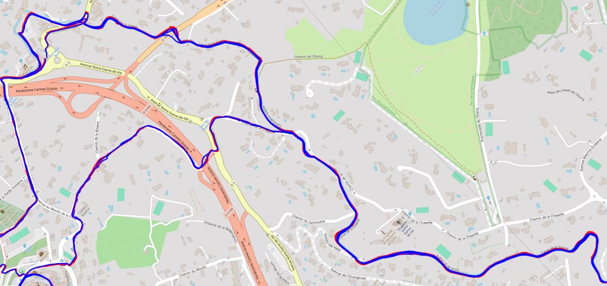 Sur l'ensemble des parcours, la trace suit bien le trajet et reste bien concentrée (je passe chaque fois au même endroit). A droite, j'ai ajouté les traces de la Forerunner 970 (en rouge). La GT Runner 2 a dévié une fois.