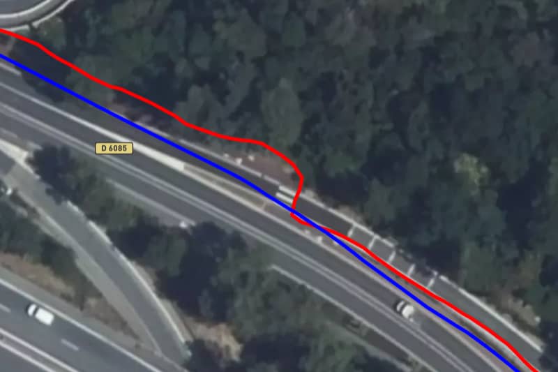 Cadre 4 : la trace change de direction sans raison, comme attirée par le bâtiment (je marche de la droite vers la gauche). Est-ce un souci lié au traitement du signal double-fréquence censé permettre de corriger les effets de réverbération du signal ?