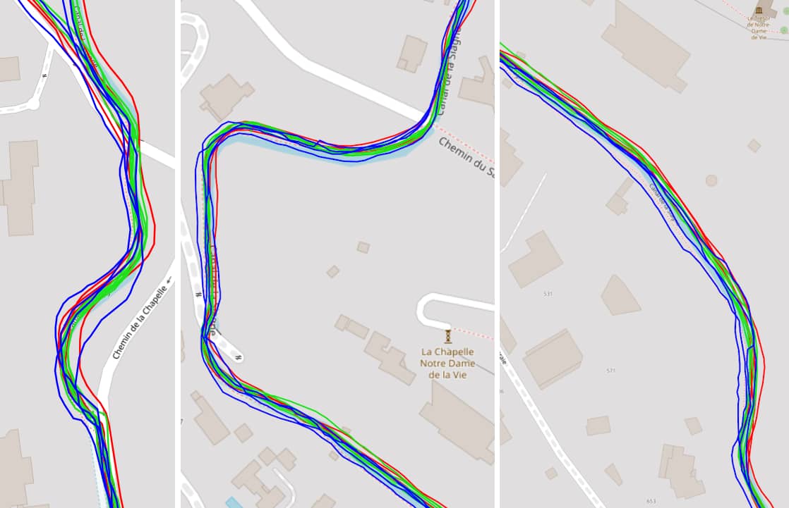 Ici, la Race 2 dévie parfois légèrement du trajet (photo de gauche). Sur la photo de droite, j'ai ajouté la trace de 2 autres montres portées en même temps.