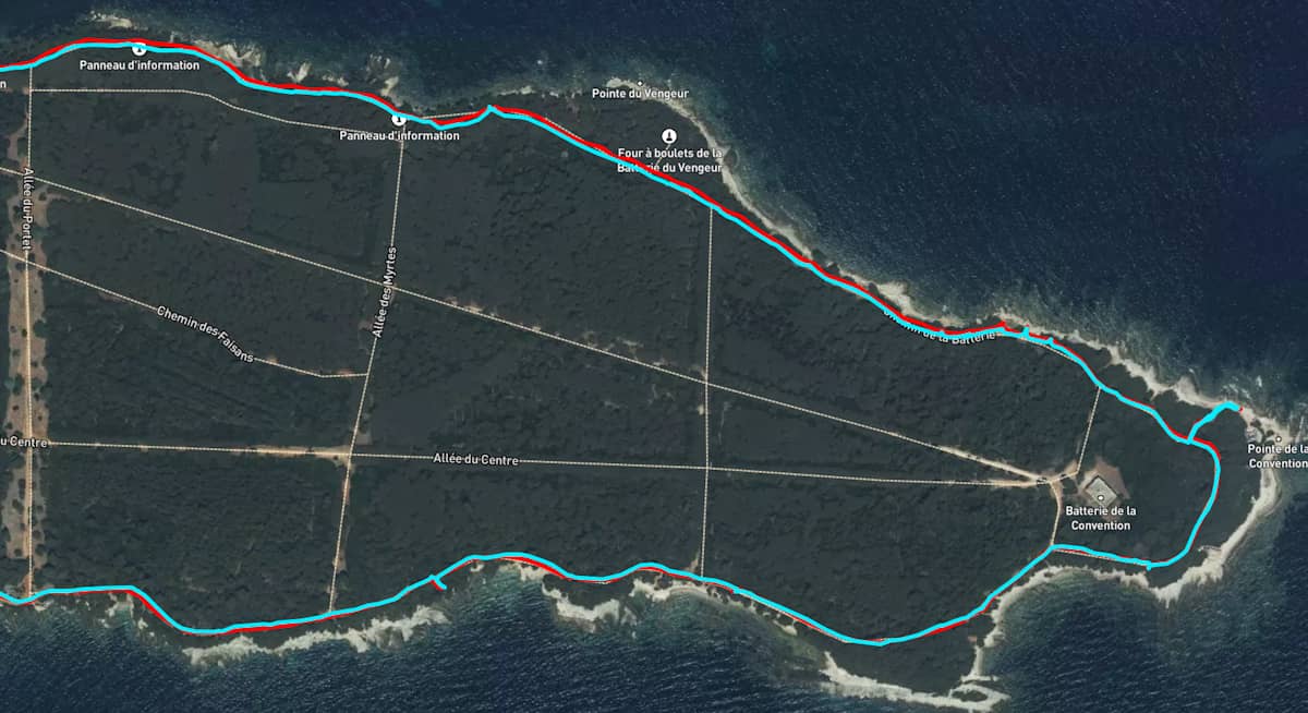 Sur les îles de Lérins, je marche sous de gros pins mais le ciel est souvent en vue. Il y a quelques écarts entre les 2 montres. La Race 2 n'est plus sur le sentier ici. A noter que je la portais à gauche, côté forêt.