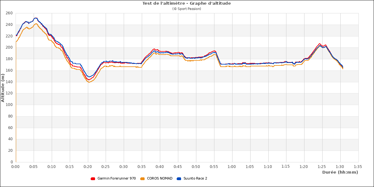 Rien à redire ici sur cette première sortie. Les 3 montres testées affichent la même altitude à 5-10m près. La Race 2 suit exactement la montre Garmin sauf sur la partie plate en fin de parcours (un canal dont l'altitude réelle est de 170 m). En revanche, je constate une différence de 25 m environ sur les dénivelés (montées et descentes) avec les 2 autres montres (voir tableau récapitulatif plus loin).